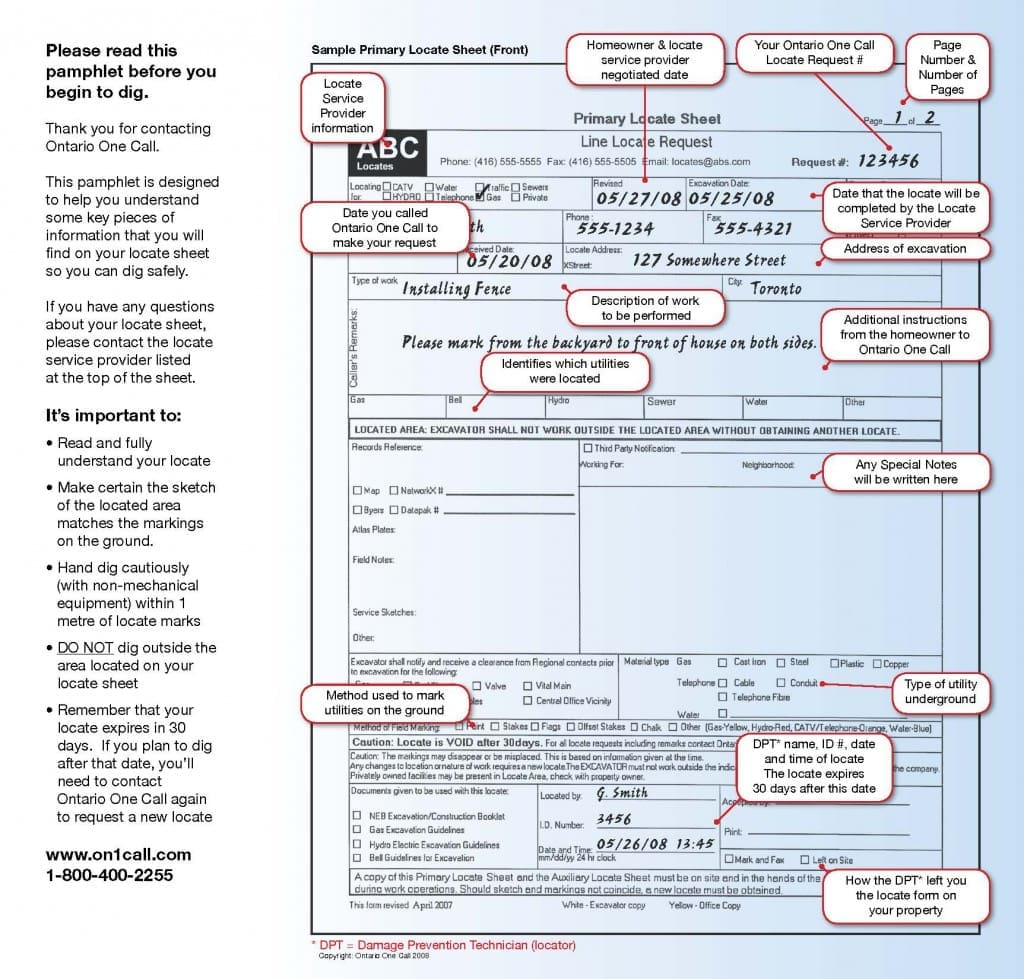 Now that you have your locate papers and paint is on the ground, what does it all mean? Here is an excellent breakdown of what type of information you can find on your completed locate papers courtesy of Digsafe Ontario.